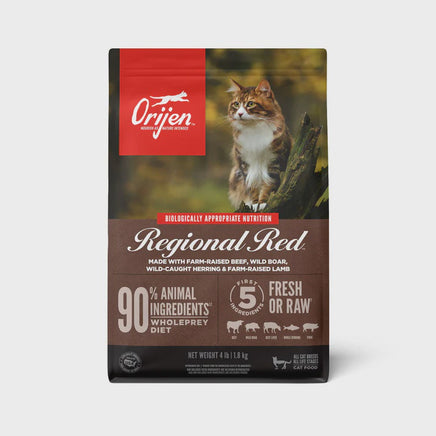 Help your cat thrive with the power of protein-rich recipes that provide peak nourishment. As obligate carnivores, modern cats are built like their ancestors and thrive on a Biologically Appropriate diet rich in protein and fat sourced from a variety of animal ingredients. ORIJEN™ Regional Red™ diet is made with meat from fresh or raw farm-raised beef, wild boar, wild-caught herring, and farm-raised lamb. Packed with Whole Prey animal ingredients like meat, organs and bone, ORIJEN food is made with the most nutrient-dense, succulent parts of the prey to deliver the nutrition cats need. With 90%1 animal ingredients and a freeze-dried coating, this diet is beyond comparison.
